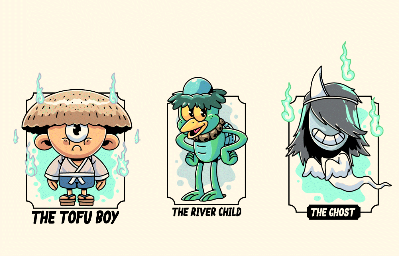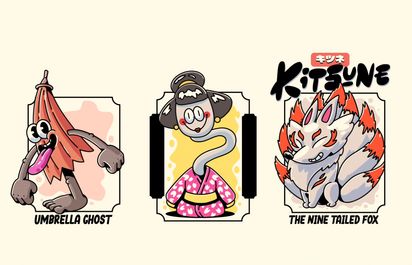 These characters are versatile and adaptable, making them perfect for merchandising (such as T-shirts), branding for events, or promotional materials, where their fun and approachable appearance will captivate audiences. Whether it's on a T-shirt worn at a festival, a key visual for an event, or even stickers, each Yokai will add a unique flair, bringing a sense of mystery, culture, and fun with a retro vibe.